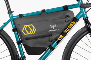 The Pack fits into the bike’s main triangle, providing a large space for bulky items — anything from cooking gear and tent poles, to heavy tools on longer expeditions and bikepacking trips. The resulting low centre of gravity is spread along a narrow, central plane, resulting in a Pack that has minimal effect on handling while offering a high volume of storage space.