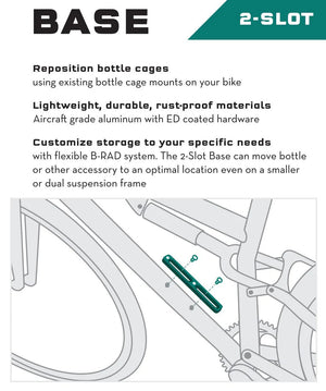• The 2-slot base can move a bottle or other accessory up to 54mm to an optimal location even on a smaller or dual suspension frame
