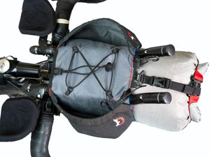 The Pitchfork is a 2-part holster system featuring gigantic stretch woven side pockets with a removable 6 Ultra 200 denier drybag. The pockets easily swallow light clothing layers and can securely stow calories from a gas station resupply. To optimize the size of the pockets the holster wraps over the bars rather than strapping underneath. This allows for both bigger pockets and provides fast access to a flat platform top mounted bungee system. Everything is designed for quick access and all cords are field replaceable for the long haul.